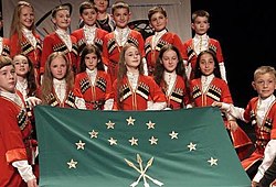 - Geleneksel kıyafetlerini giyinmiş bir grup Adige çocuk.