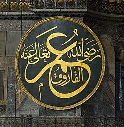 İstanbul'daki Ayasofya Camii'nde bulunan Ömer'in hat sanatıyla yazılmış isminin olduğu levha