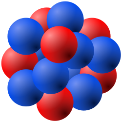 Proton (kırmızı) ve nötronlardan (mavi) oluşan atom çekirdeği modeli. Bu gösterimde proton ve nötronlar birbirine bağlı küçük toplara benzemektedir, ancak gerçekte (çağdaş çekirdek fiziği) çekirdek bu biçimde açıklanamaz. Doğru bir biçimde açıklamak için kuantum fiziğine gereksinim duyulur.