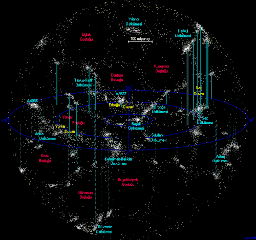 Dünya'nın gözlemlenebilir evren'deki konumunu ve komşu gökada süperkümelerini gösteren bir diyagram. (Alternatif resim.)