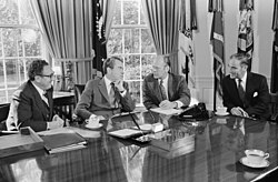ABD'li siyasetçiler (Kissinger, Nixon, Ford, Haig) Beyaz Saray'ın Oval Ofisinde Temsilci Ford'un başkan yardımcılığına adaylığını tartışıyor