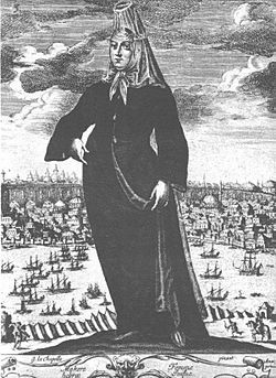 17. yüzyılın ortalarında İstanbullu bir Yahudi kadın betimlemesi. Recueil de divers portraits des principales dames de la Porte du Grand Turc, (~1650)'de yer alan ve yaratıcısı G. la Chapelle olan bir gravür (şu anda Kudüs'teki İsrail Müzesi'nde yer almaktadır).