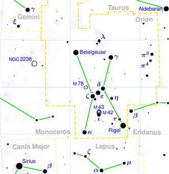 Avcı Takımyıldızı (Orion) haritası. Sarı kesik çizgilerle çevrilmiş kısım Avcı Takımyıldızı göstermektedir. Yıldızların oluşturduğu avcı figürü kolaylıkla görülebilmekte.