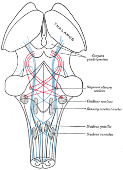 Medial lemniscus mavi renkte, lateral lemniskus kırmızı renkte gösterilmiştir. | |