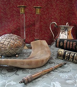 Judaica (en üstten saat yönünde): Şabbat şamdanları, el yıkama kâsesi, Chumaş ve Tanakh, Torah işaretçisi, şofar ve etrog kutusu